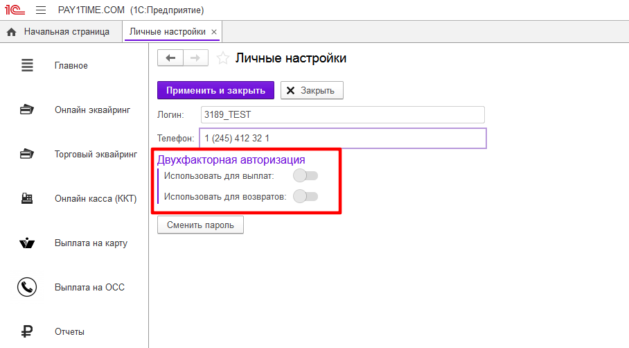 Например, можно подключить двухфакторку на совершение выплат или на возвраты. То есть, если вы хотите, чтобы данная учетная запись, с которой вы заходите, не могла отправлять реестр на выплаты через личный кабинет или совершать возвраты без подтверждения по СМС, то вы можете подключить 2ФА проверку перейдя в настройки "Главное" -> "Личные настройки"